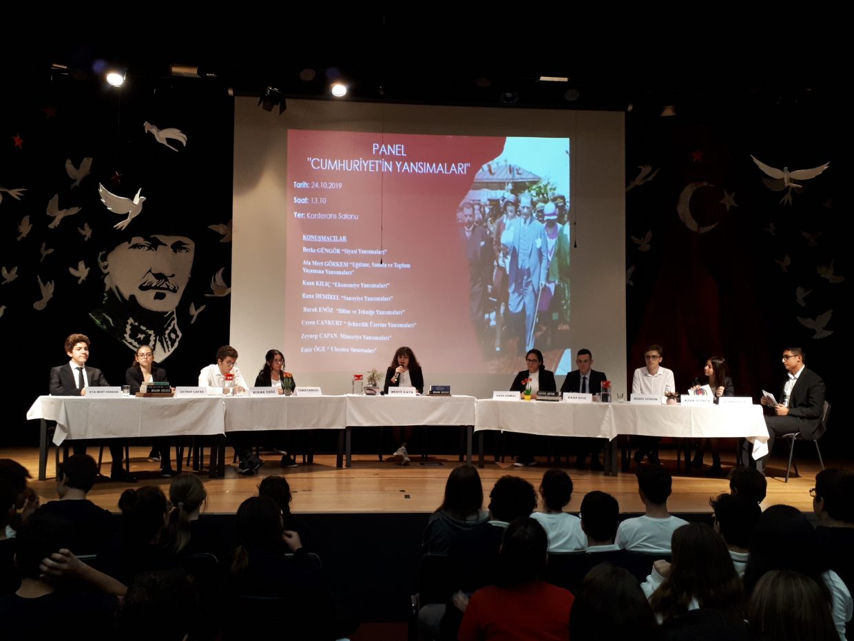 29 Ekim Cumhuriyet Bayramı kapsamında 10. sınıf öğrencilerimizin gerçekleştirdiği “Cumhuriyet’in Yansımaları” adlı panelimiz 31 Ekim 2019 tarihinde “Zeynep S. ÇAPAN, Ata Mert GÖRKEM, Ceren CANKURT, Berke GÜNGÖR, Emir ÖĞE, Azra UĞURER, Rana DEMİREL, Kaan KILIÇ, Burak ENÖZ’ün katılımıyla 10/D sınıfından G. Merve KAYA’nın moderatörlüğünde gerçekleşmiştir. Cumhuriyet’in; siyasetten, toplum yaşamına, bilimden hukuka, şehirleşmeden mimariye, ekonomiden sanayiye, ulaşıma kadar çeşitli başlıklar altında yansımalarını Osmanlı Dönemi ile de karşılaştırarak tartışmışlardır. 10/C sınıfından M. Mirkan ÖZTÜRK, arkadaşlarına teknik yönden destek vererek daha zengin bir tartışma ortamı oluşturmuştur. TED Atakent gençleri olarak Cumhuriyet’in yansımalarını başarıyla tartışan öğrencilerimizi kutluyoruz.